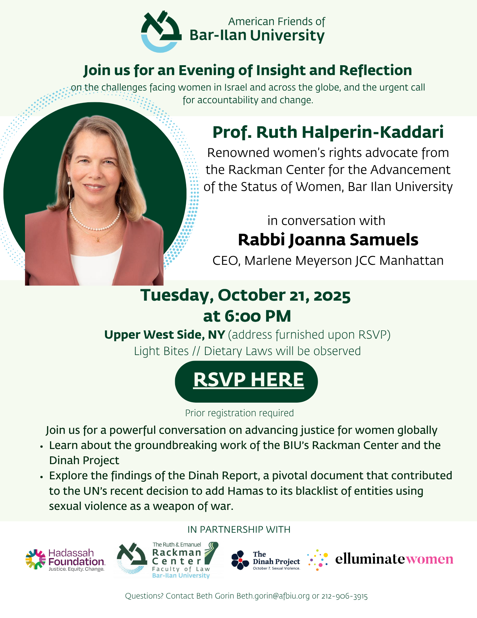 The Hadassah Foundation is delighted to cosponsor a free in-person event on Tuesday, October 21 with Prof. Ruth Halperin-Kaddari and Rabbi Joanna Samuels. The Rackman Center for the Advancement of the Status of Women, which Prof. Halperin-Kaddari leads, is one of the Foundation’s longtime grant recipients Scroll down for event details and registration link.